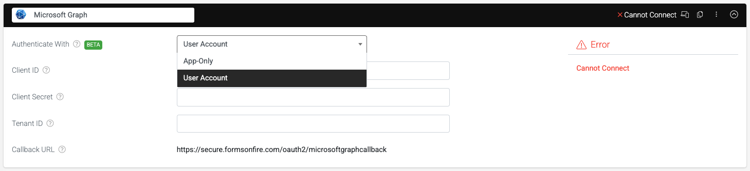 You must first decide whether to authenticate your MS Grah connection with “App-Only” permissions or with “User Account” permissions, which depends on the API permissions path taken when registering your App in the MS Azure Portal.