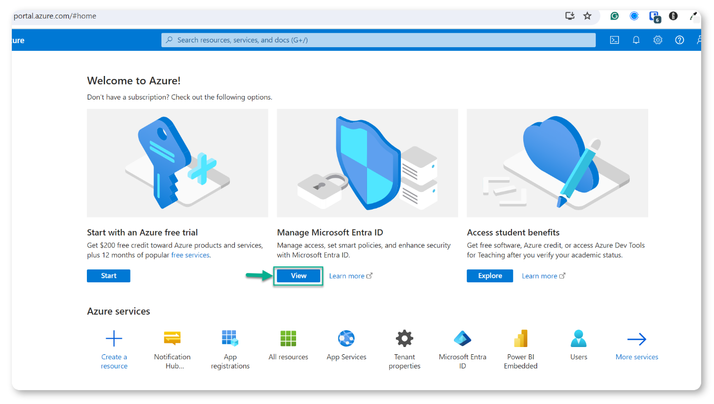 Click the View button on the "Manage Microsoft Entra ID" option to proceed to the next step where you can start the App Registration process.