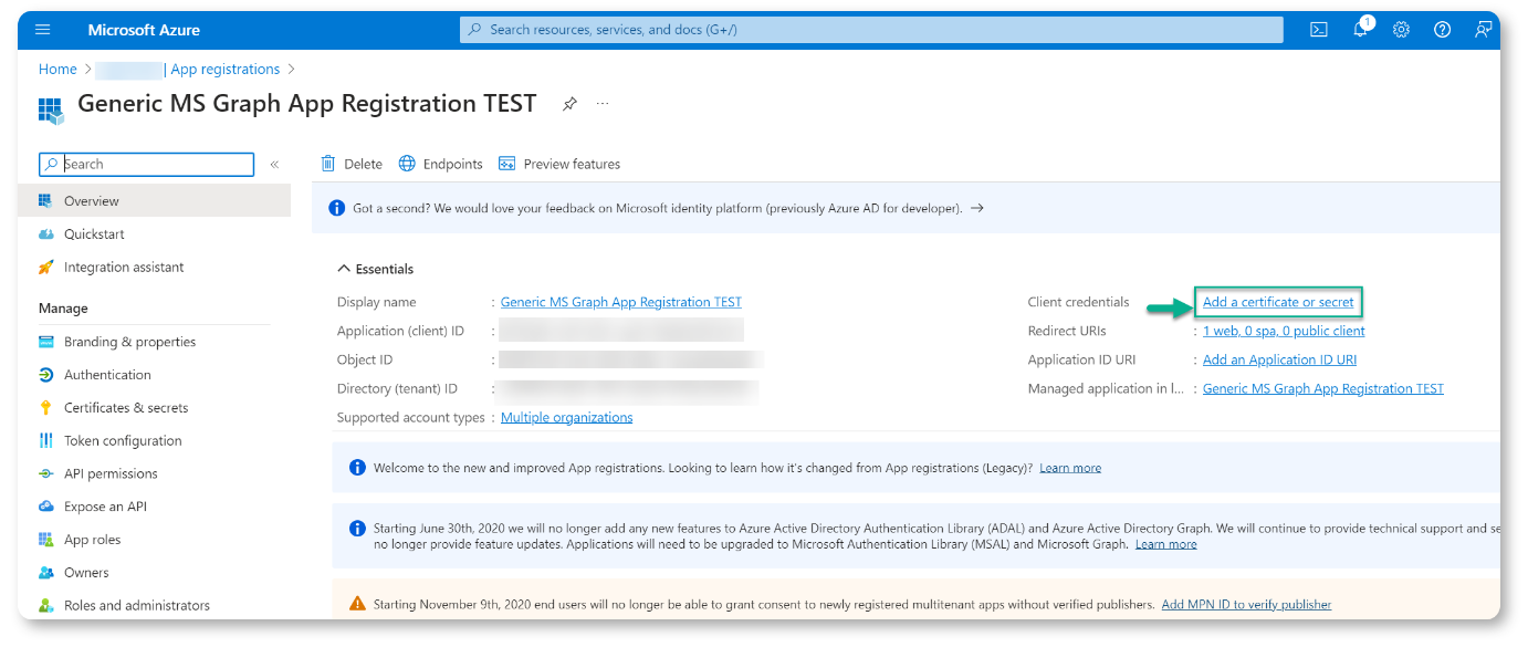 - The Client Secret Value will need to be created by clicking the link next to "Client Credentials" called "Add a certificate or secret", as show in in the screenshot below: