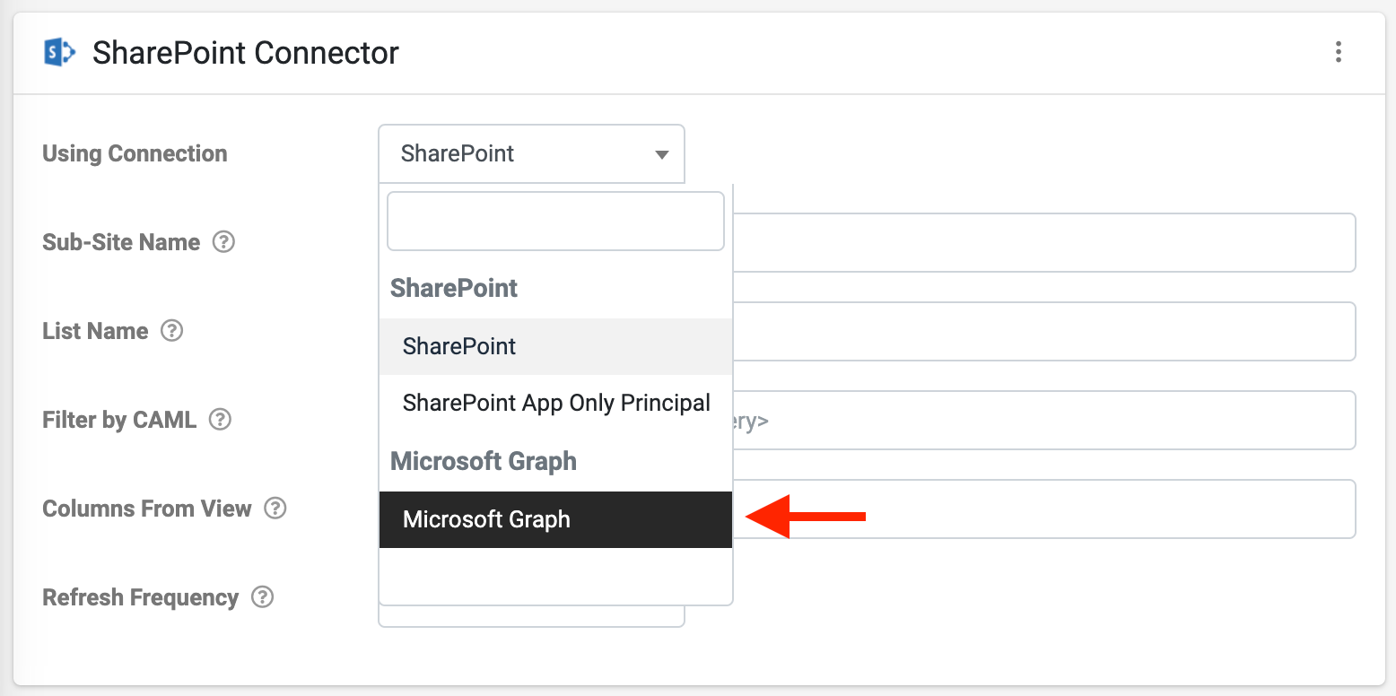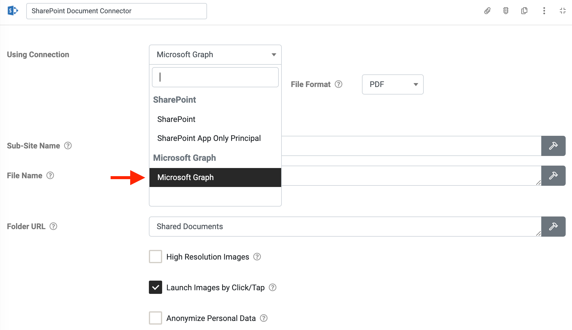 When adding a Sharepoint Document or List Form Connector, under Using Connection, select the MS Graph Connection as opposed to a Sharepoint Connection.