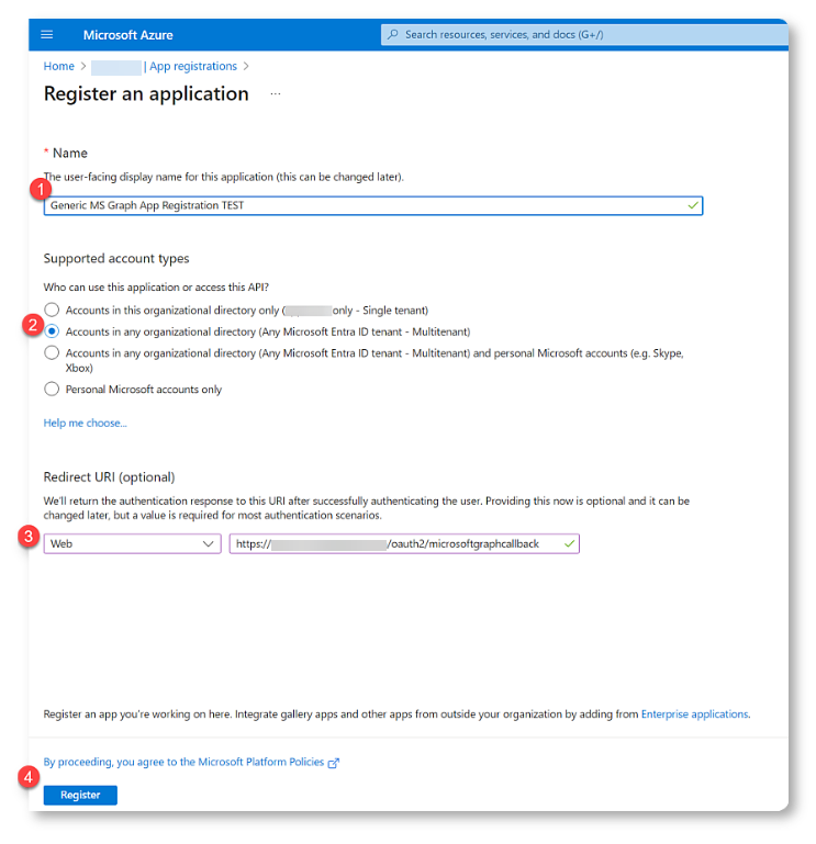 - Who can use this application or access this API? - (Selecting the 2nd option - "Accounts in any organizational directory (Any Microsoft Entra ID - Multitenant)" will work for most use cases)