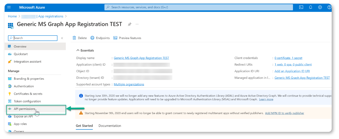 Each Microsoft Service that you wish to connect to through this app registration process, requires you to configure specific API permissions for it so that it can perform correctly on our platform. On the app registration overview page, click the "API Permissions" option in the left menu to get started.